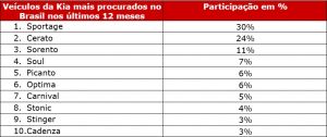 Segundo os dados da plataforma, o Sportage desponta na liderança como o veículo da Kia mais visitado pelos brasileiros no período, com 30% de participação entre os 10 mais visitados da marca. Na sequência, estão Cerato (24%), Sorento (11%), Soul (7%), Picanto (6%), Optima (6%), Carnival (5%), Stonic (4%), Stinger (3%) e Cadenza (3%).